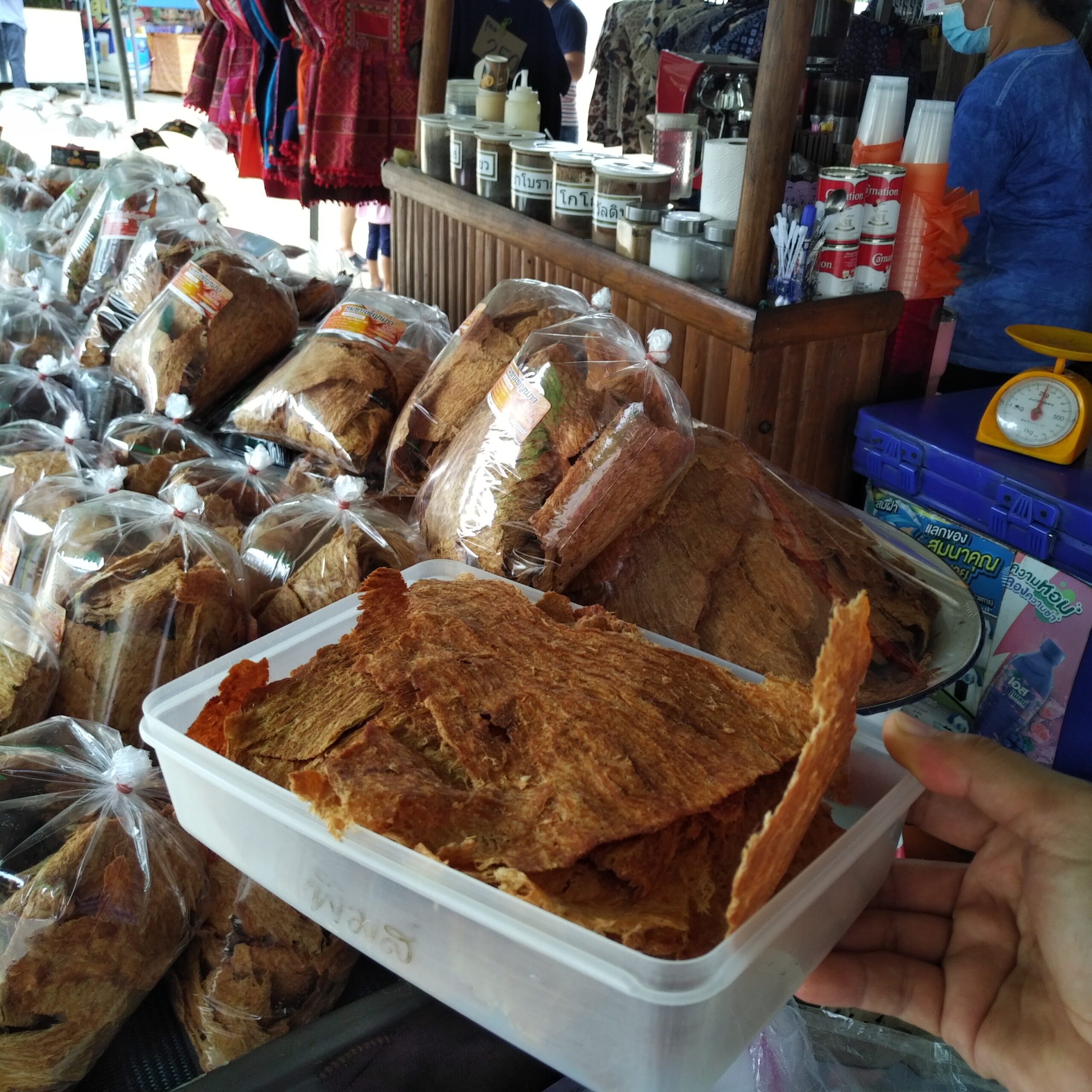 ร้านขายของฝากที่วัดพระธาตุช่อแฮ มีหมูทุบหน้ากินมาก ร้านนี้สามารถตักใส่ภาชนะที่เราเตรียมมาเองได้ ไม่ได้มีแต่แบบใส่ถุงอย่างเดียว